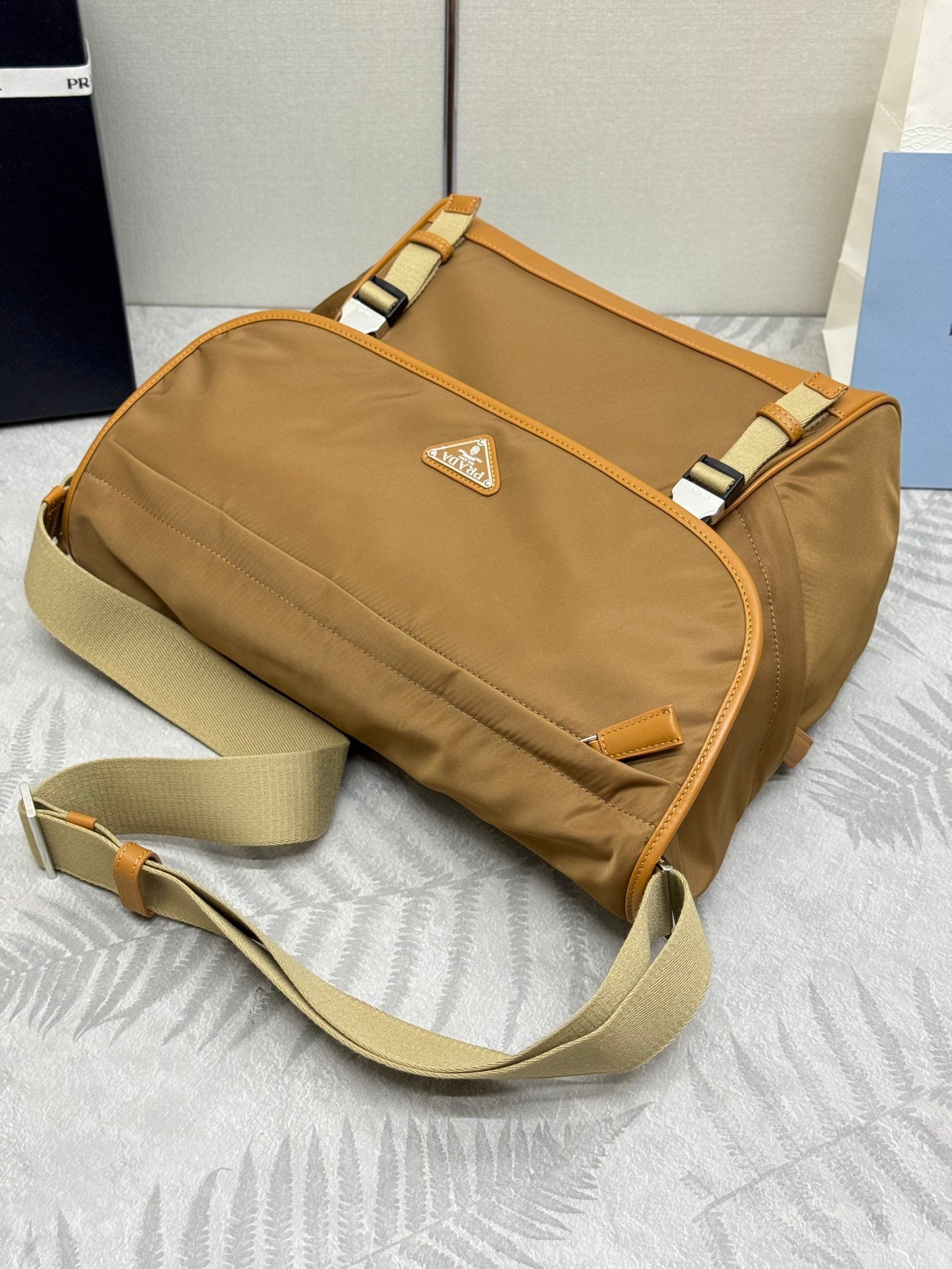 This new messenger bag 2VD052A is designed from recycled nylon yarn Re-Nylon with flap and snap closure, three exterior zippered pockets, interior zippered pocket and patch pocket. Large capacity space, adjustable woven trimmed shoulder strap, large capacity space. Another classic pop-up one, hurry up and get your hands on it