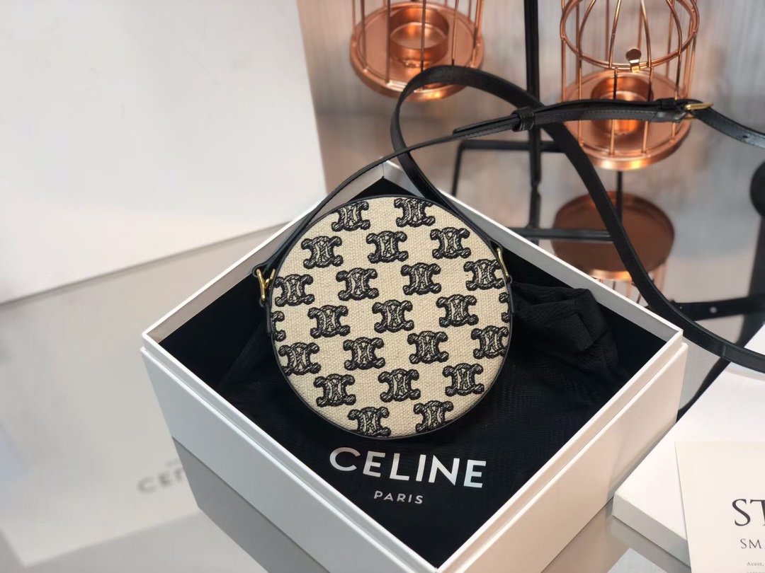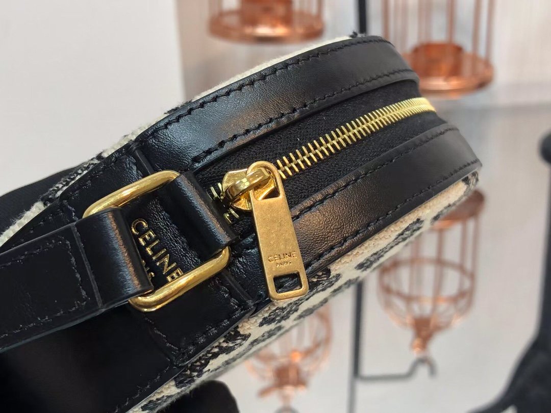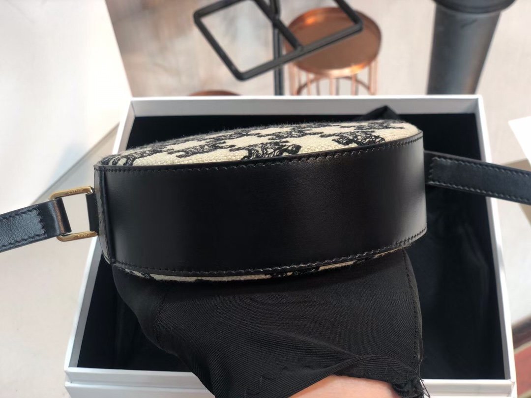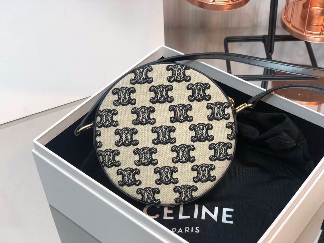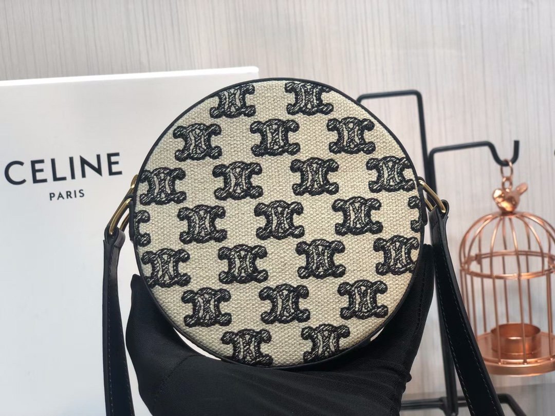TRIOMPHE Embroidered Canvas and Cowhide Pie Bag 🎊 ~ Pie shaped crossbody and coin purse is playful and cute ♠️. Fabric lining, crossbody and shoulder carry 🆒. (Model: 10G342) 480