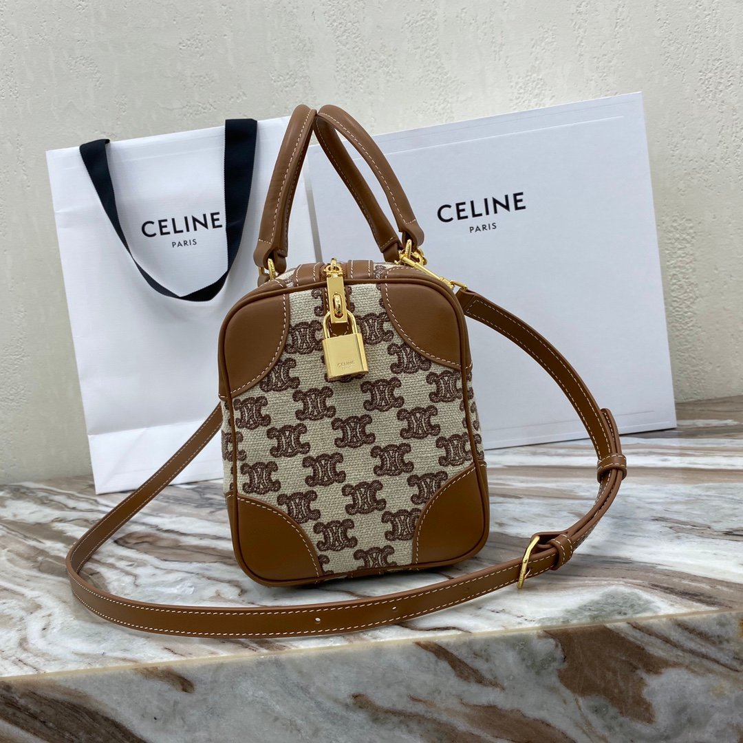 Home BAGS CELINE TRIOMPHE Embroidered Fabric Small Boston Handbagn10 X 7 X 6 inches (26 X 17 X 14 cm)nEmbroidered Fabric, Cowhide Leather WrapnLining : FabricnZipper LockingnAdjustable Detachable Shoulder StrapLength 20 inches (50 cm)nHandle Length 5 inches (12 cm)nHandlenNumber: 193652CS8.27FXnP850