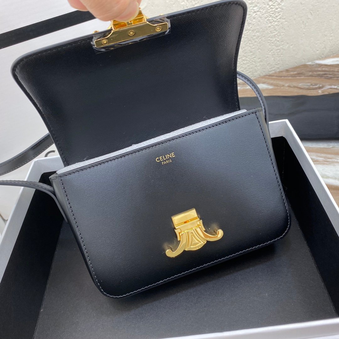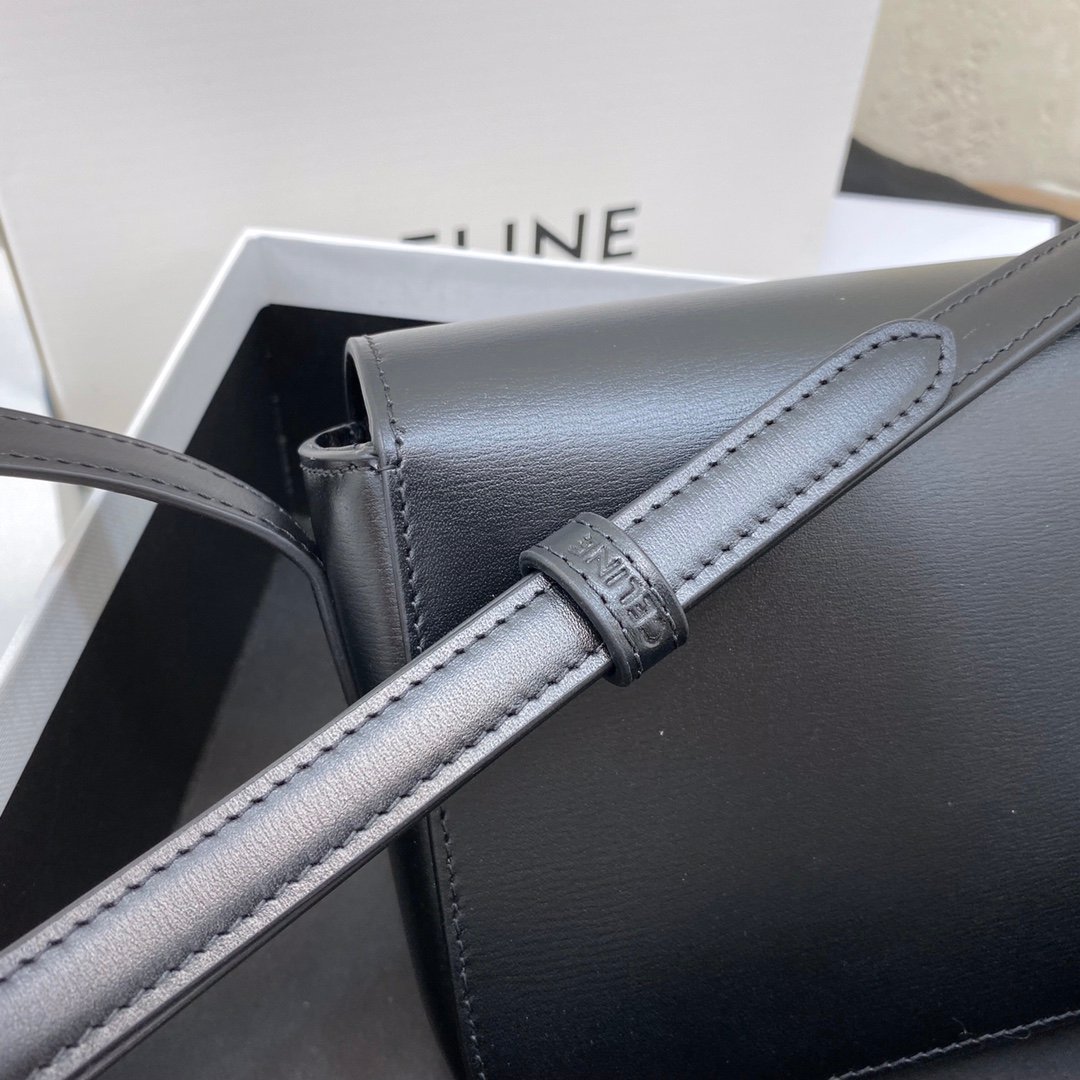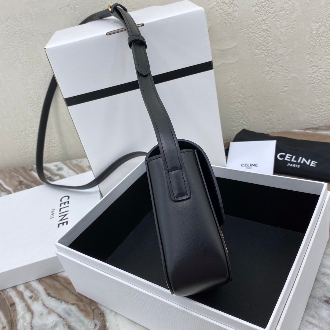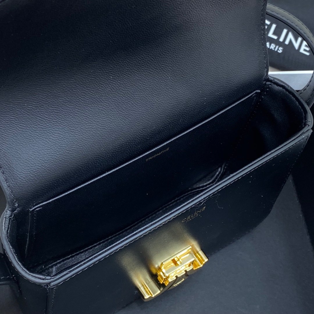 Home BAGS CELINE TRIOMPHE NANO (EXTRA SMALL) SHINY CALF LEATHER HANDBAG n6 X 5 X 2 INCHES (16.5 X 11.5 X 5 cm)n100% Calfskin leathern100% Lambskin leather liningnGolden metallic piecesnCrossbody and shoulder carrynTRIOMPHE Metallic textured locking claspnInterior flat pocketsnAdjustable Leather Shoulder Strap length 19 inches (49 cm)nNo. : 191903bf4.24rs i780