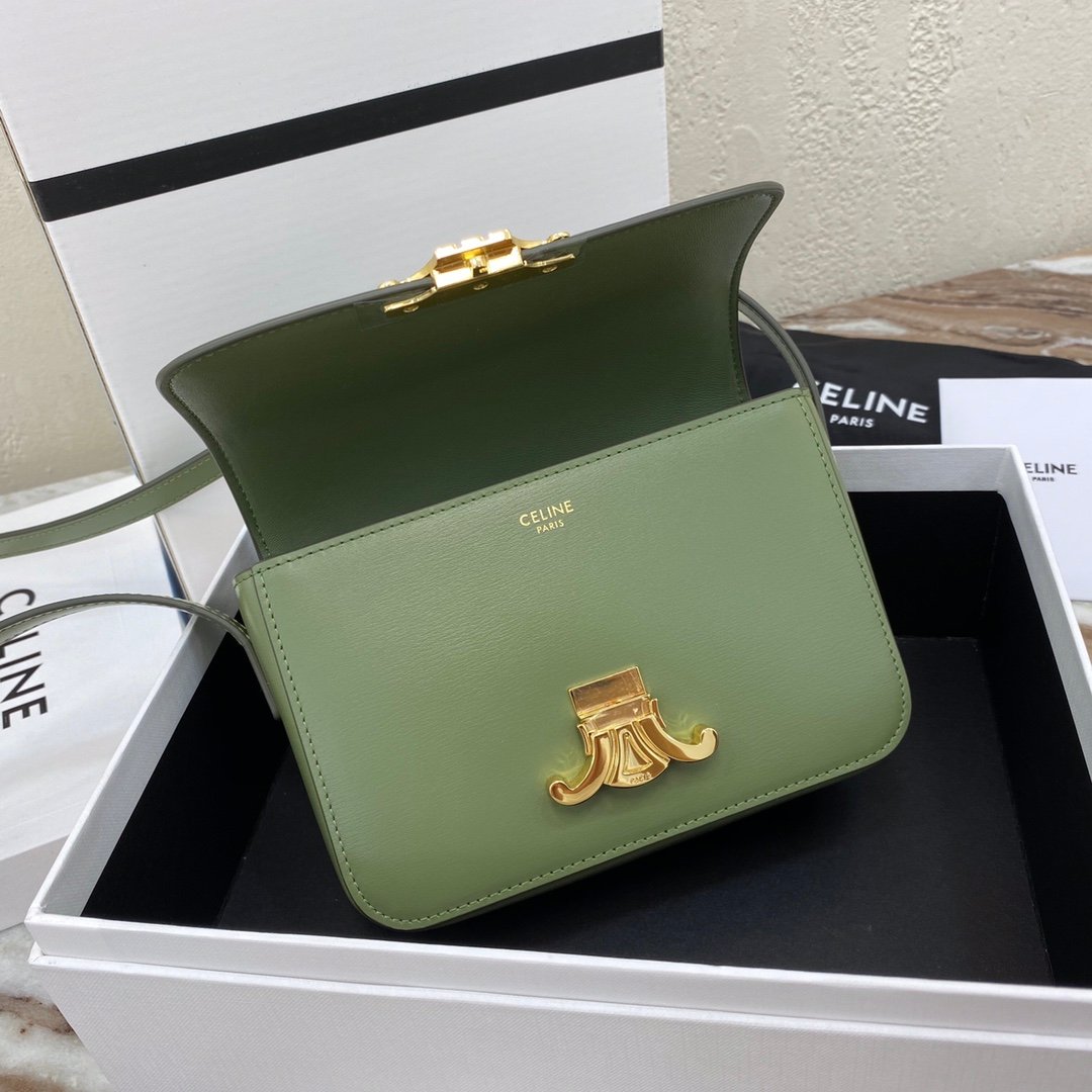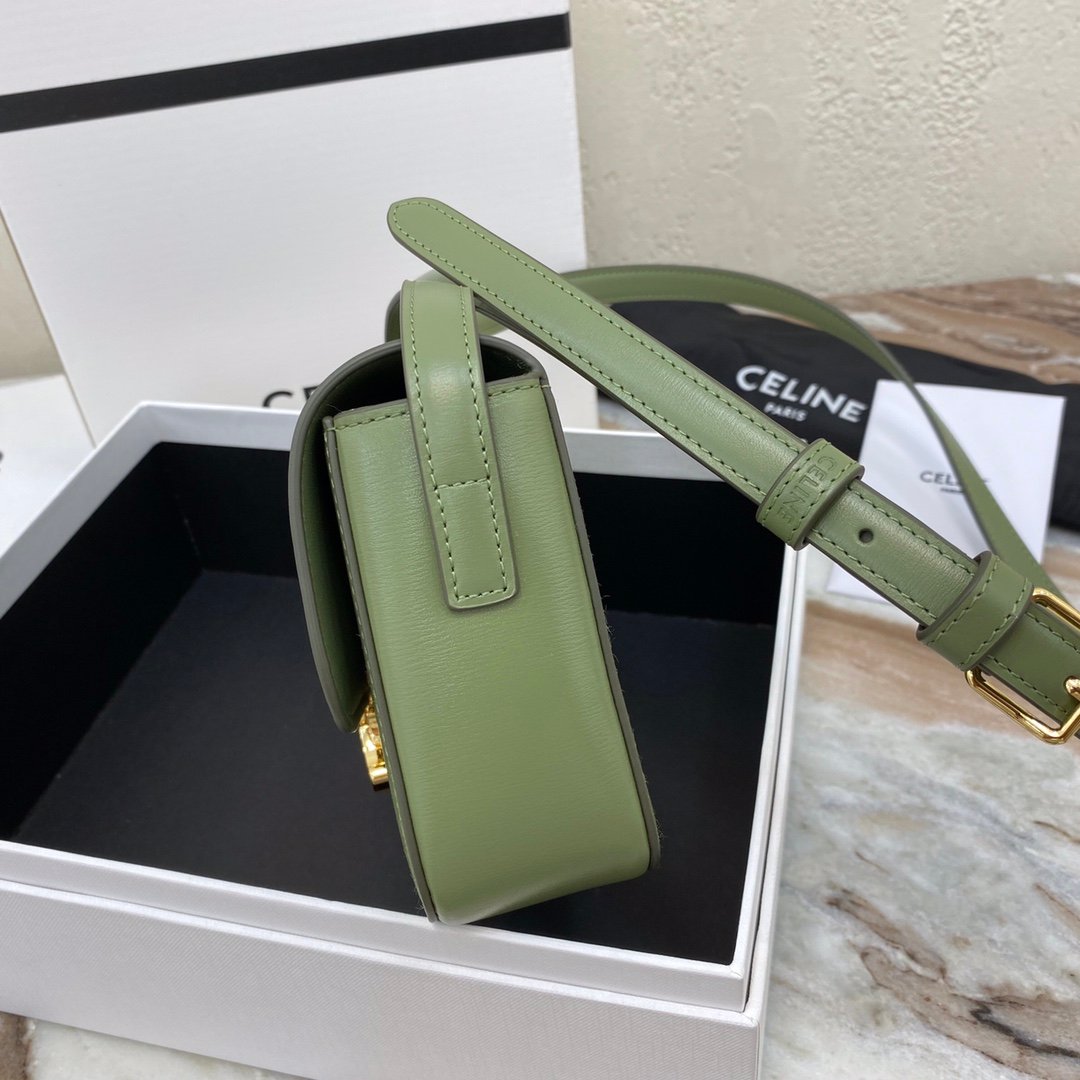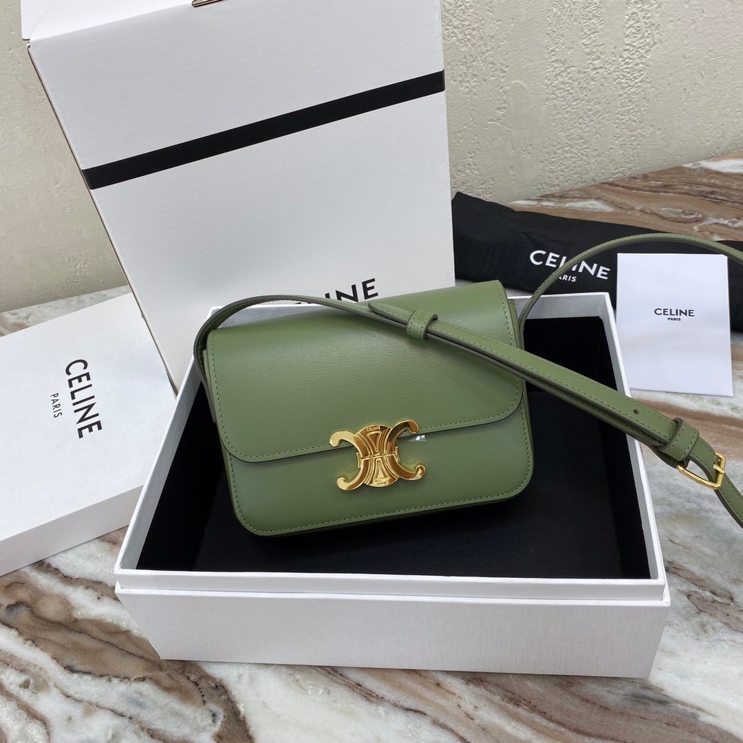 Home BAGS CELINE TRIOMPHE NANO (EXTRA SMALL) SHINY CALF LEATHER HANDBAG n6 X 5 X 2 INCHES (16.5 X 11.5 X 5 cm)n100% Calfskin leathern100% Lambskin leather liningnGolden metallic piecesnCrossbody and shoulder carrynTRIOMPHE Metallic textured locking claspnInterior flat pocketsnAdjustable Leather Shoulder Strap length 19 inches (49 cm)nNo. : 191903bf4.24rs i780