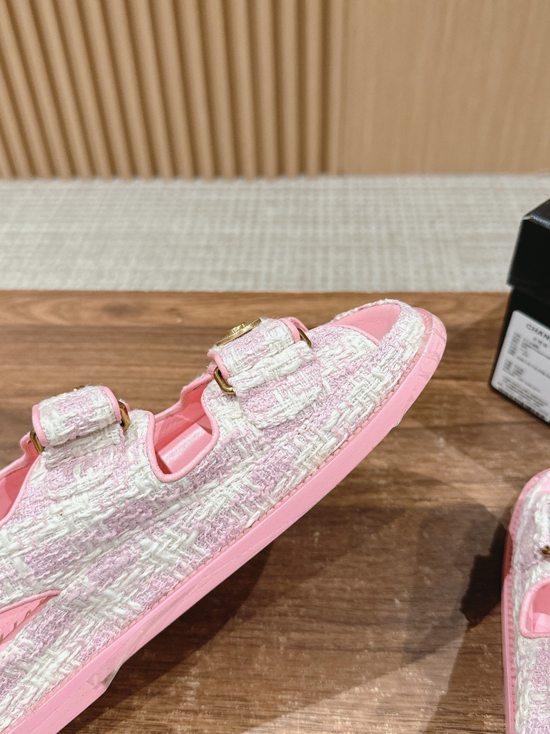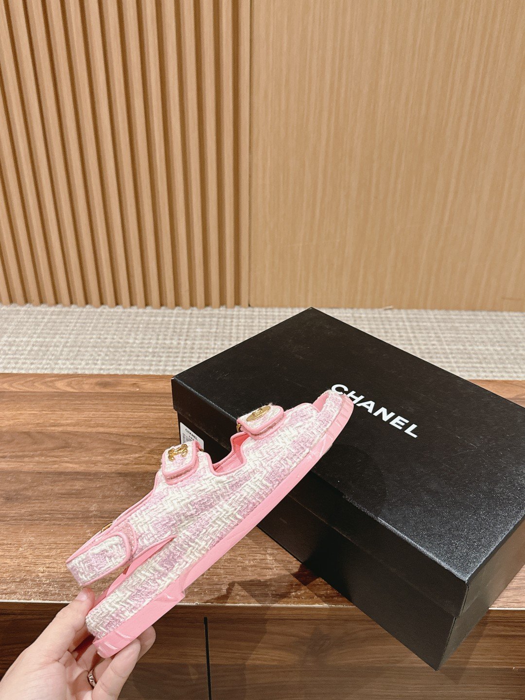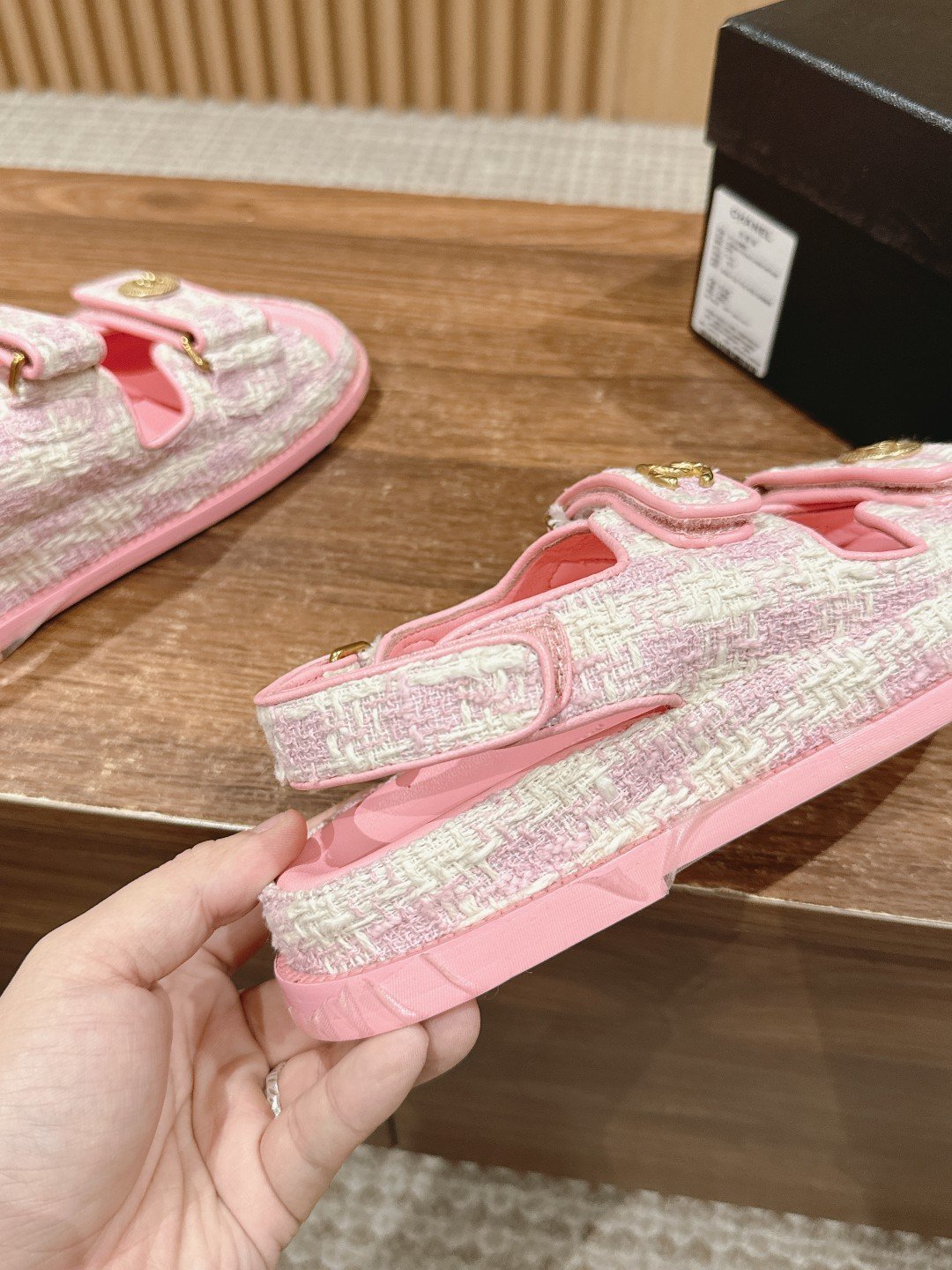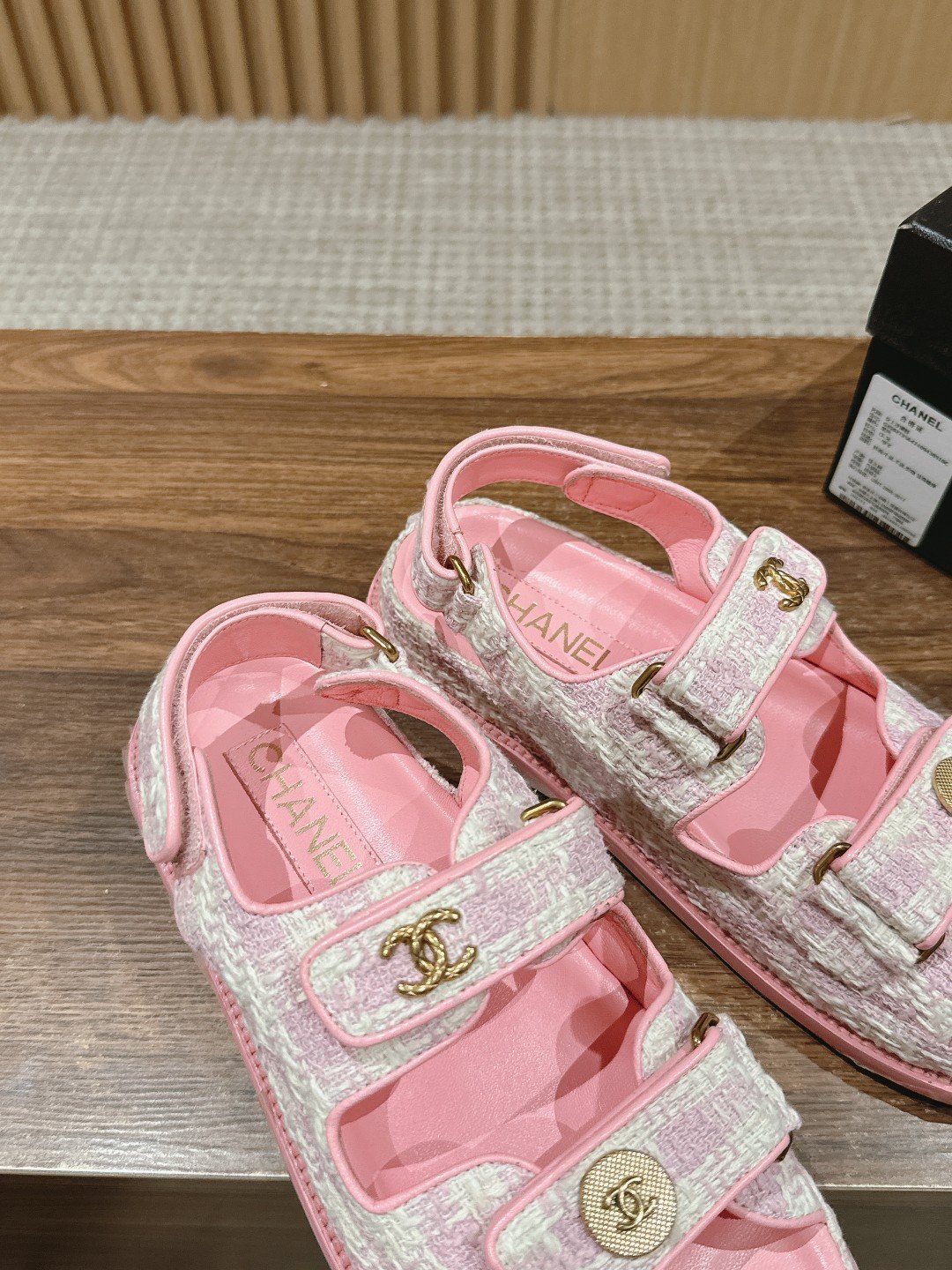 [Upgraded] 𝐂𝐇𝐀𝐍𝐄𝐋 Chanel Classic Velcro Beach Sandals n🔥 Every year, Grandma Chanel’s classic Velcro series of hot items will always appear! The blingbling velcro are all sparkling, classic double 𝐂 accessorized design, a treasure sandal worth getting! nnExcellent craftsmanship, customized original lambskin, cowhide sheepskin Sheepskin Special materials Cowboys Tweed, nThree-layer handmade leather outsole imported from Italy Genuine leather along the stripes edge nnSize: 35-39 (40 customized non-returnable)n