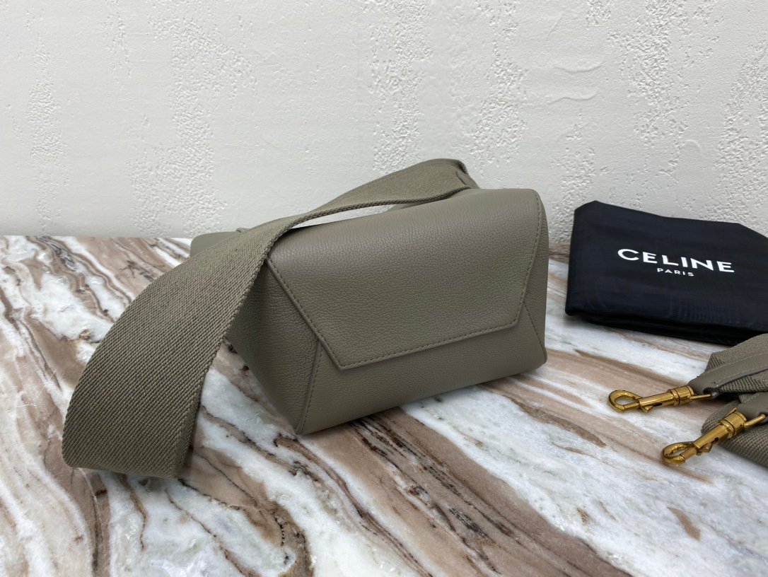 CELINE BELT MINI mini grained calf leather handbag with 1 leather handle, 1 detachable shoulder strap and 1 zipped pocket on the outside back. This handbag features two closure options: top flap and zipper. nSize 11 X 9 X 7 inches (28 X 23 X 17 cm)n100% Calfskin leathern100% Calfskin leather liningnGolden metal hardwarenShoulder or handheldnMagnetic snap top flap closure and top flap lower zipper closurenInterior double flat pocketsnBack exterior flat pocketnDetachable leather shoulder strap 14 inches (36 cm)nTote handle 4 inches (9 cm)n Protective foot studsn No. 175523 P1050