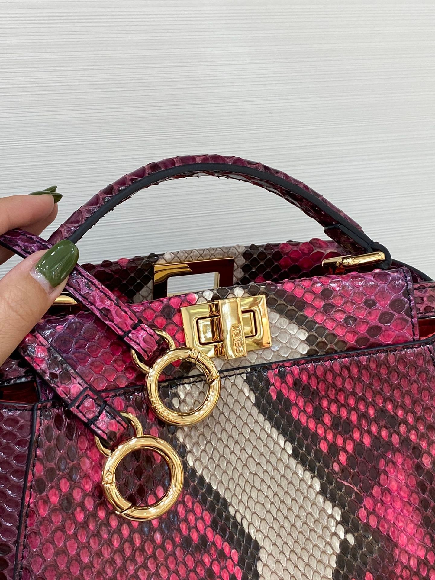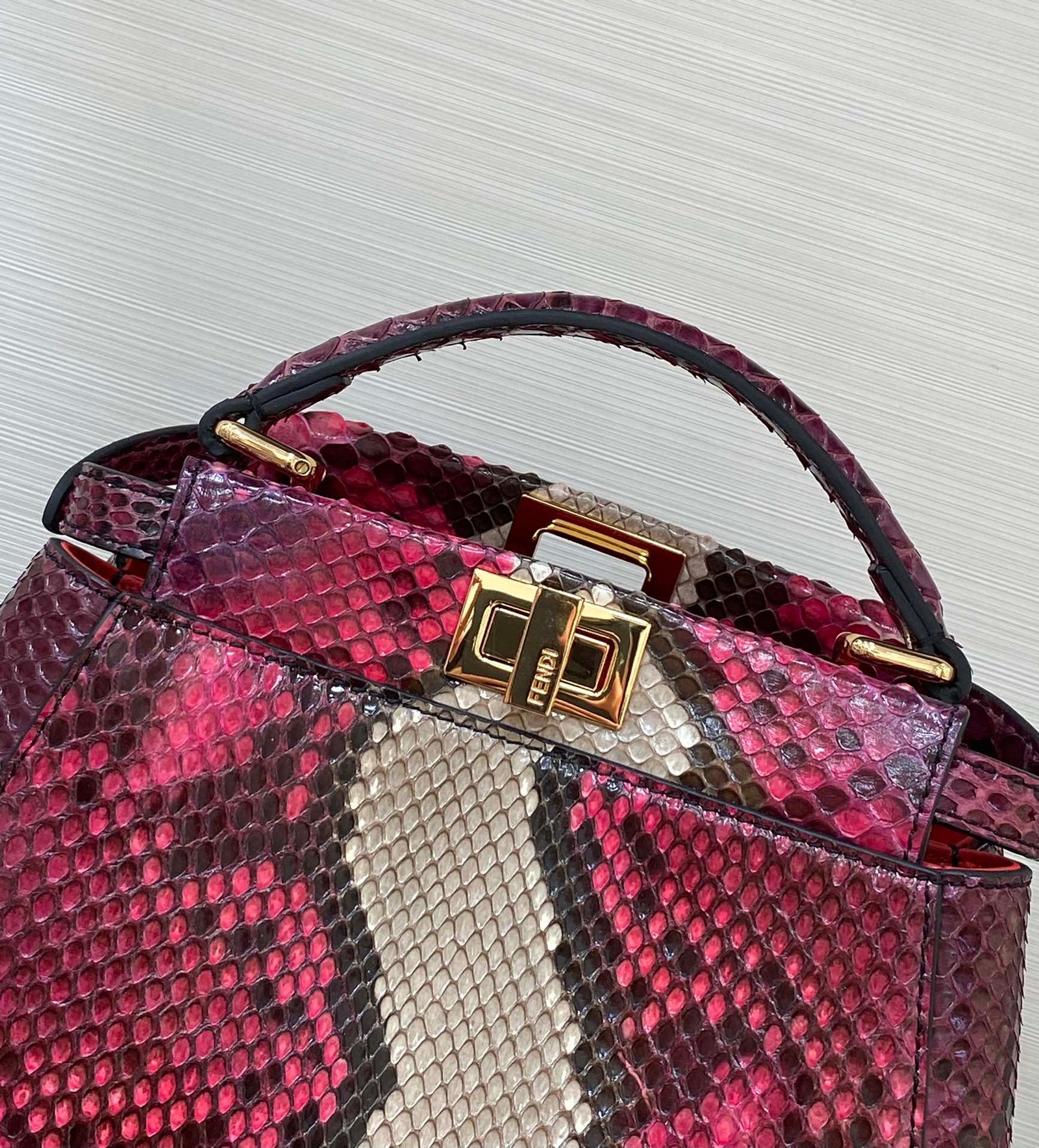 “With a full set of counter packaging”n senior sense, not you, Fendi this bag super senior sense of visual sense of glossy ultra-obvious snakeskin bag type, but also fendi’s representative peekaboo series, the bag regardless of the daily, or to attend a dinner party are very versatile, Size: 23✖️18✖️12cmn Item: 244 snakeskin