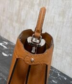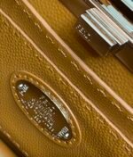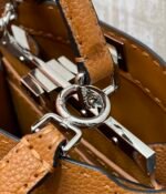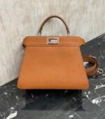PeekabooISeeU medium handbag in lychee grain calf leather, embellished with classic twist locks on both sides, lined in soft nappa leather, with two compartments separated by a rigid divider, complete with a tie closure internal pocket and gold-tone metal hardware. The bag comes with handles and an adjustable, detachable shoulder strap that can be added with a tortoiseshell buckle, a sophisticated and durable bag