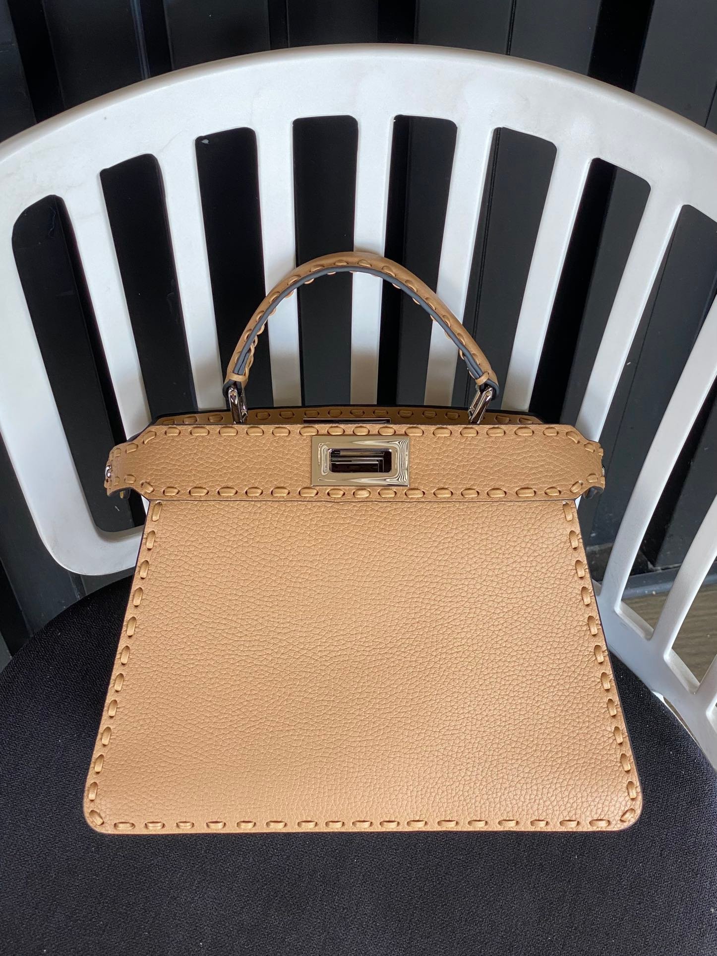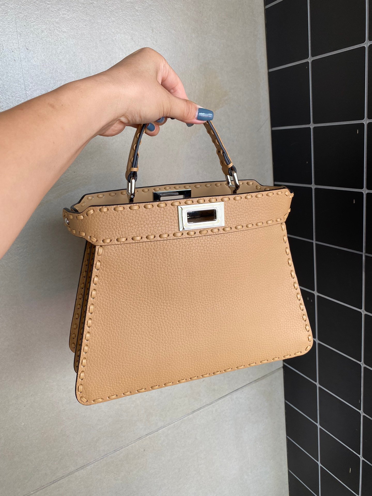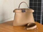 FEND1PeekabooISeeU medium handbag in lychee grain calf leather, embellished with classic twist locks on both sides, soft nappa leather lining, two compartments separated by a rigid partition, with lace-up interior pockets and gold-tone metal parts. The bag comes with handles and an adjustable, detachable shoulder strap with tortoiseshell buckle, a sophisticated and durable bag